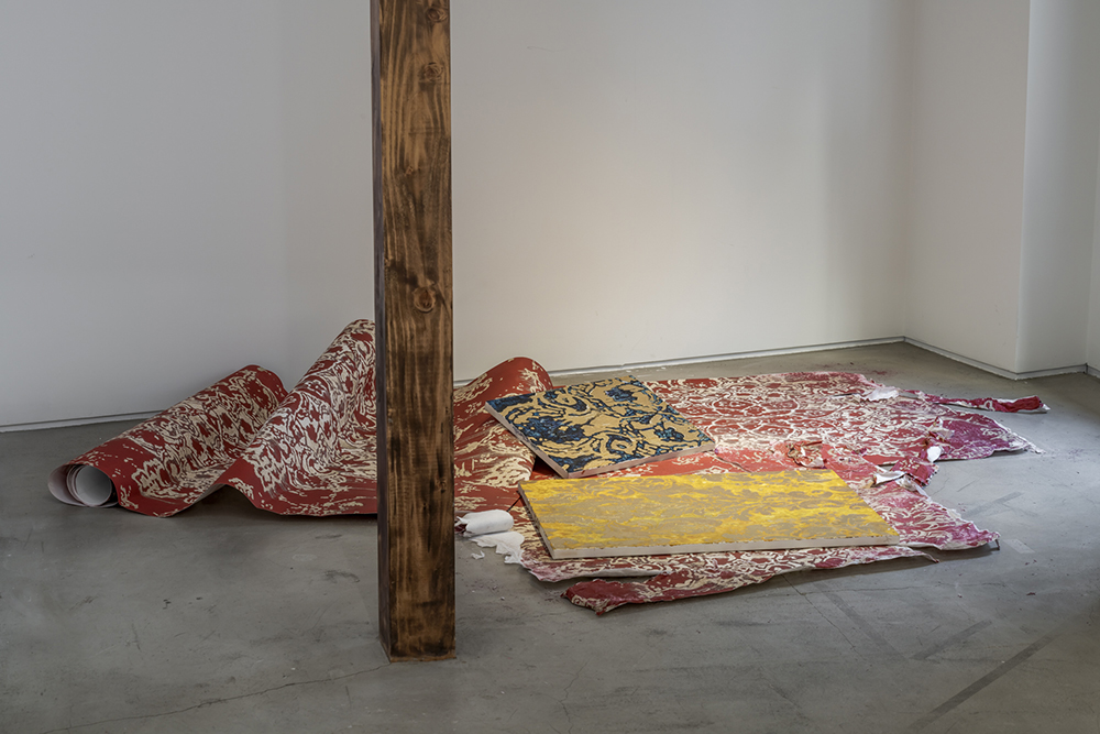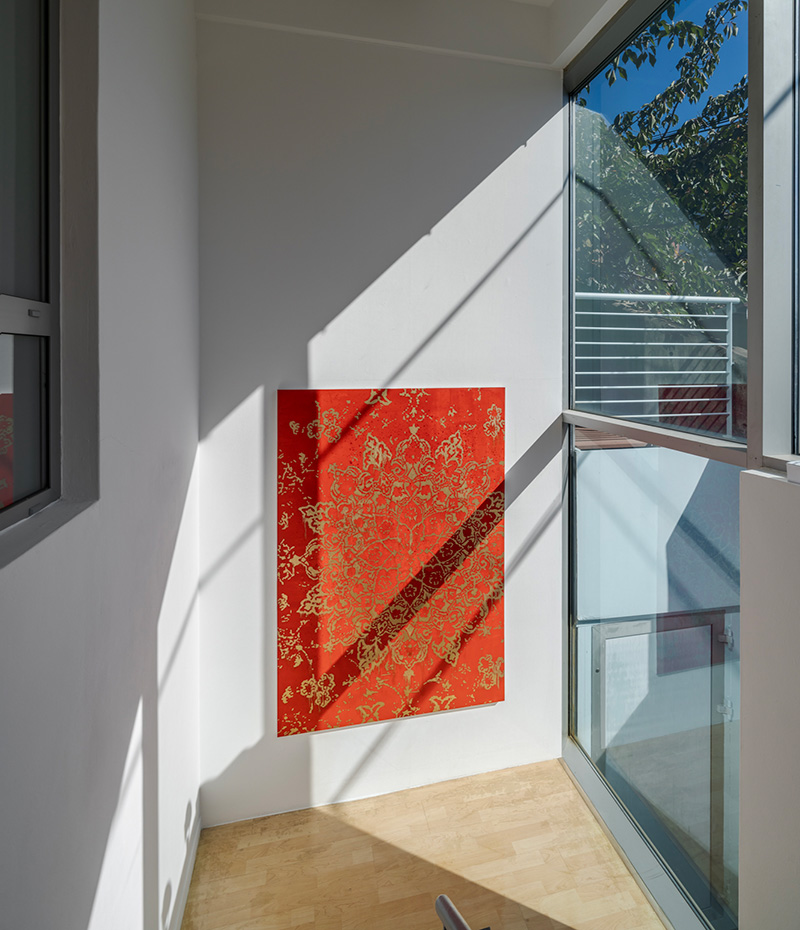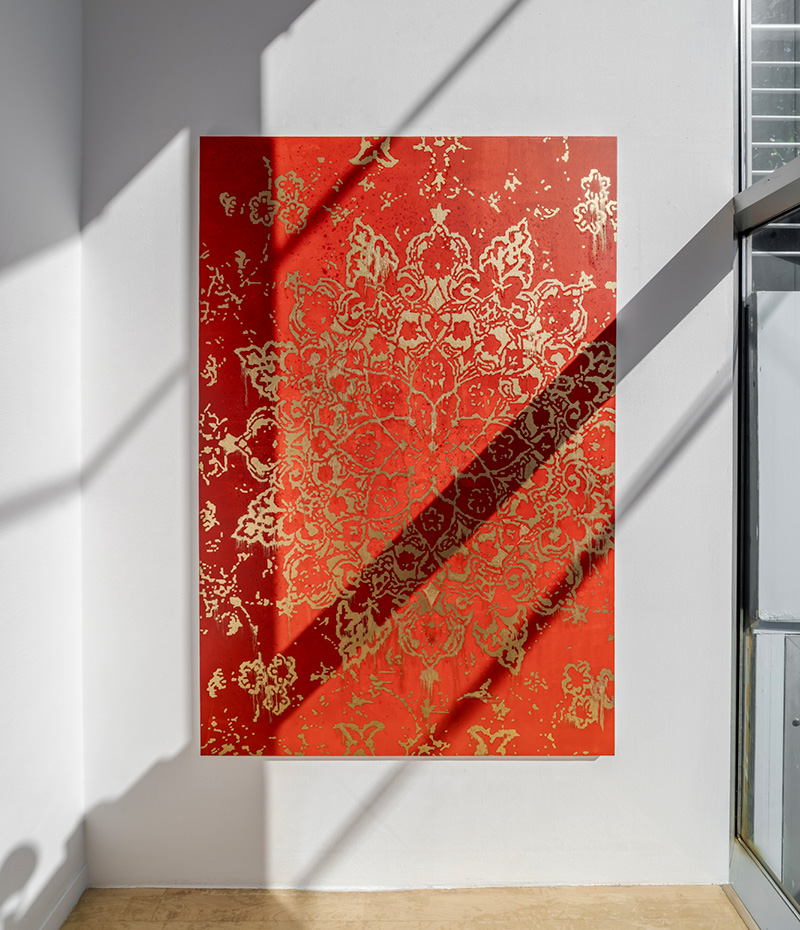 계단을 따라 2층으로 올라가는 길에 마주하는 페르시아 문양의 작품은 김성수 작가의 ‘바니타스Vanitas’ 작품이다. 성경에 기록된 전도서 1장 2절에는 “헛되고 헛되니 모든 것이 헛되도다 Vanitas vanitatum et omnia vanitas”는 말이 전해진다. 이 말에 등장하는 라틴어 바니타스는 인간의 유한함과 풍요의 덧없음을 이야기한다. 실크로드를 장악한 페르시아를 상징하는 문양이자 당시 귀족만이 소유할 수 있었던 문양을 대표하는 작품은 그 자체로 과욕과 욕망을 대변한다. 전시 제목에도 등장하는 바니타스는 단어의 의미 자체로 김성수작가의 작품 전체를 관통한다. 바니타스 작품에 드러난 화려한 금빛의 바래진 빛깔은 지나간 화려함과 그 뒤의 남겨진 허무함의 상징인 것이다.