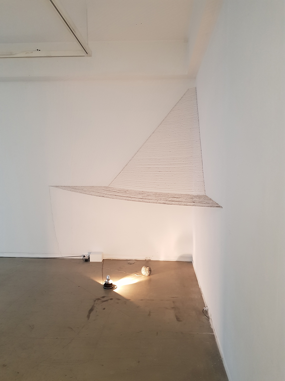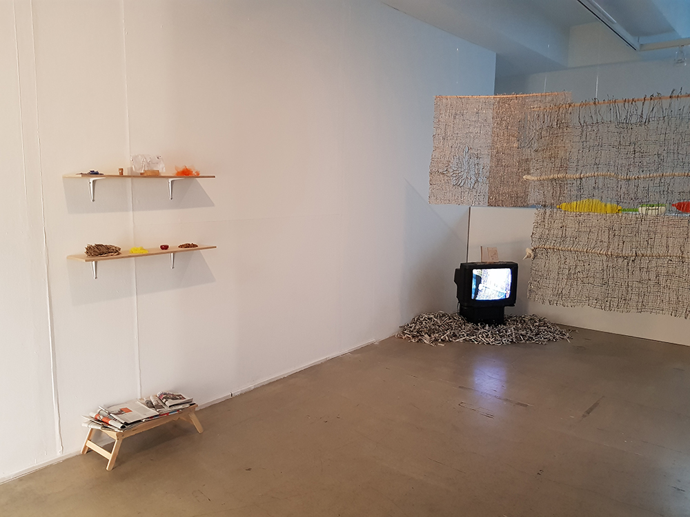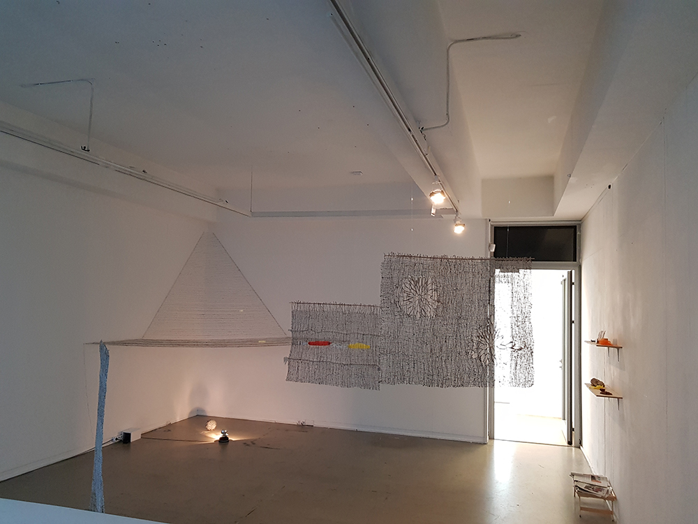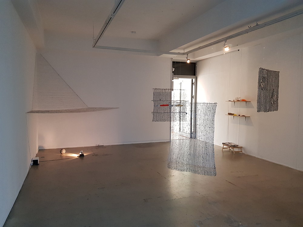 1층에 전시된 한석경의 작품은 지난 3월부터 5월의 ZK/U 레지던시 입주의 결과물이다. 한석경은 물질을 수집하면서 그 물질을 통해 다양한 방향성을 지닌 관계를 보여주는 작가이다. 작가는 특정 장소와 해당 장소만의 물질을 소재 삼아 시공간을 드러내고자 하였다. ZK/U에서 작업한 <기억의 커튼>(2017)은 베를린에서 거주하는 동안 도시 곳곳에 버려진 신문들을 수집하여 이를 베틀을 이용해 엮어낸 작품이다. 신문은 정보를 전달하는 매체이지만 이방인의 시선에서는 읽힐 수 없는 생소한 물질일 뿐이다. 또한 신문은 분단 당시 동독이 서독의 생활과 정보를 확인할 수 있었던 매체였다. 작가는 이러한 신문의 특성을 이용하여 버려지고 지나간 시간의 기억들을 엮어냄으로서 일회적이었던 신문이란 매체를 통해 기억의 편린들의 집합체를 함축적으로 보여주었다.