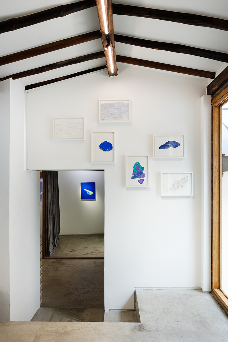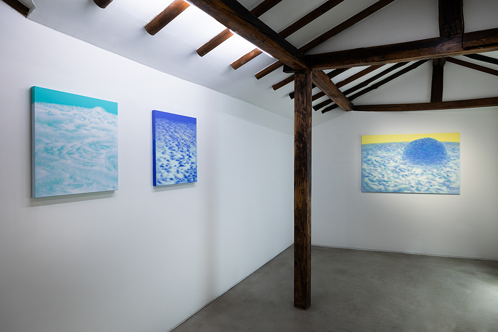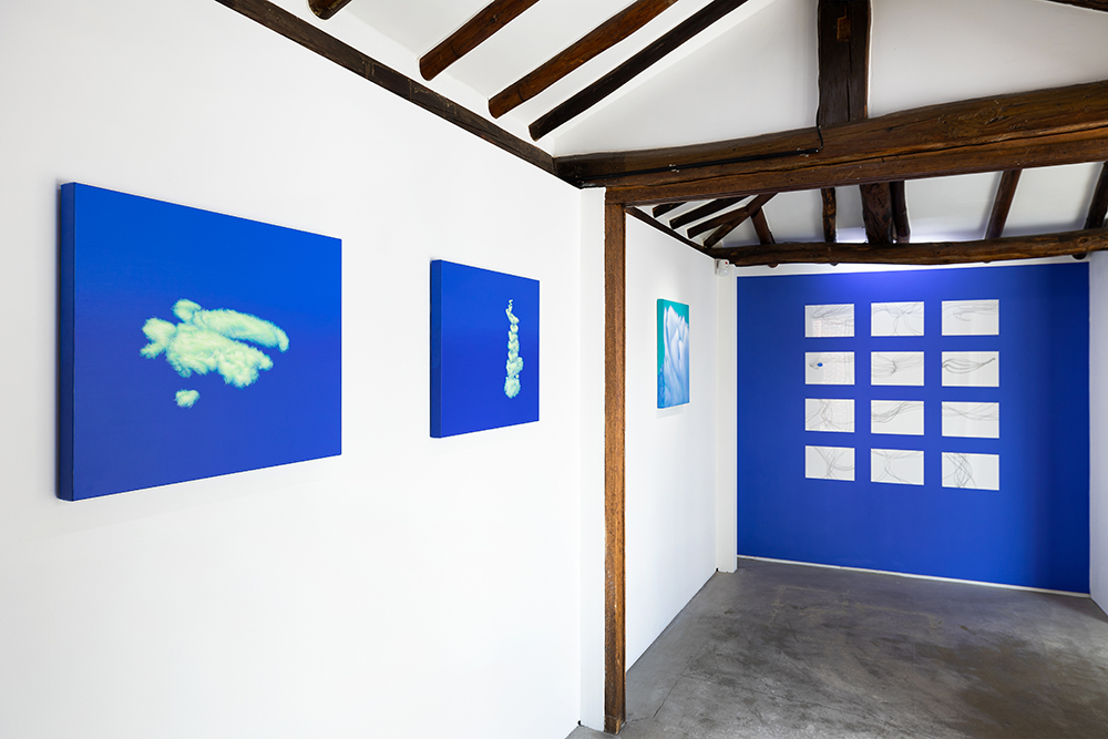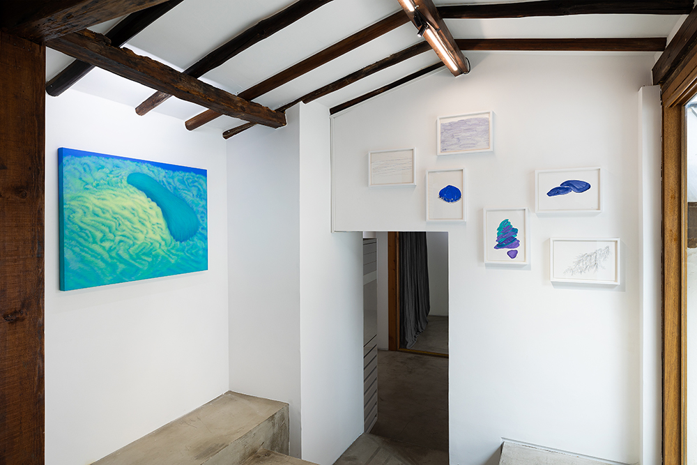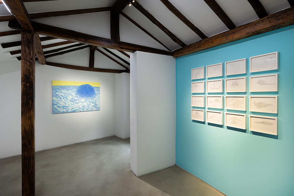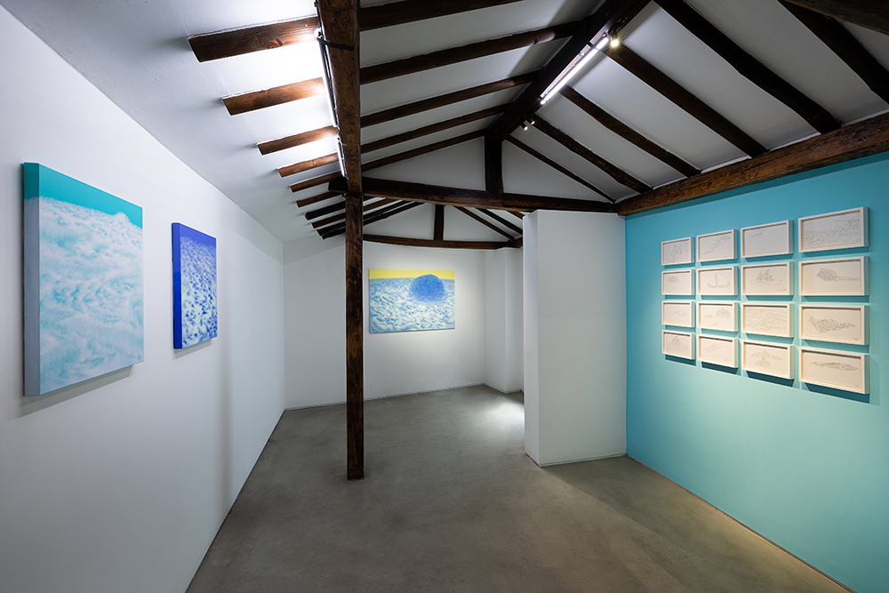 이 전시의 드로잉과 회화 작품은 최근 진행해오고 있는 ‘상상풍경(想像風景)’ 시리즈이며, 바다, 섬, 산, 바람, 물 등 자연으로부터 영감 받아 떠오른 사유의 이미지를 담고 있다. 특정 장소에서 관찰하고 경험했던 기억을 되짚어 직접 느꼈던 감정을 함께 표현한 상상풍경은 이상향의 세계로 안내한다. 여기서 이상향은 보이지 않는 영역에 대한 은유적 상상이다. 막연한 이상세계가 아닌, 현실 세계에 매우 가까이 존재하고 모호한 그 경계에서 보일 듯 상상의 장면을 곧 실제 마주할 공간처럼 그림으로 구현해낸다. 끊임없이 움직이는 구름을 만지려 손을 허공에 저어보고, 바람의 속삭임을 헤아리기 위해 청각, 촉각, 후각, 시각으로 무형의 대상을 감지해간다. 이러한 공감각으로 느껴진 연상적 형상, 즉 마음속의 생각을 담은 사의(寫意)를 표현하기 위해 손과 붓을 즉흥적으로 움직여 추상의 상(象)을 작품 안으로 불러들인다. 이전에 눈에 보이는 공간 속 경계 또는 심리적인 경계에 초점을 두었던 시기를 너머, 대상과 대상의 사이를 찾기보다 경계를 허물고 그 너머로 현실에서 곧 일어나길 희망하는 요소들을 작품 화면 안으로 소환한다.