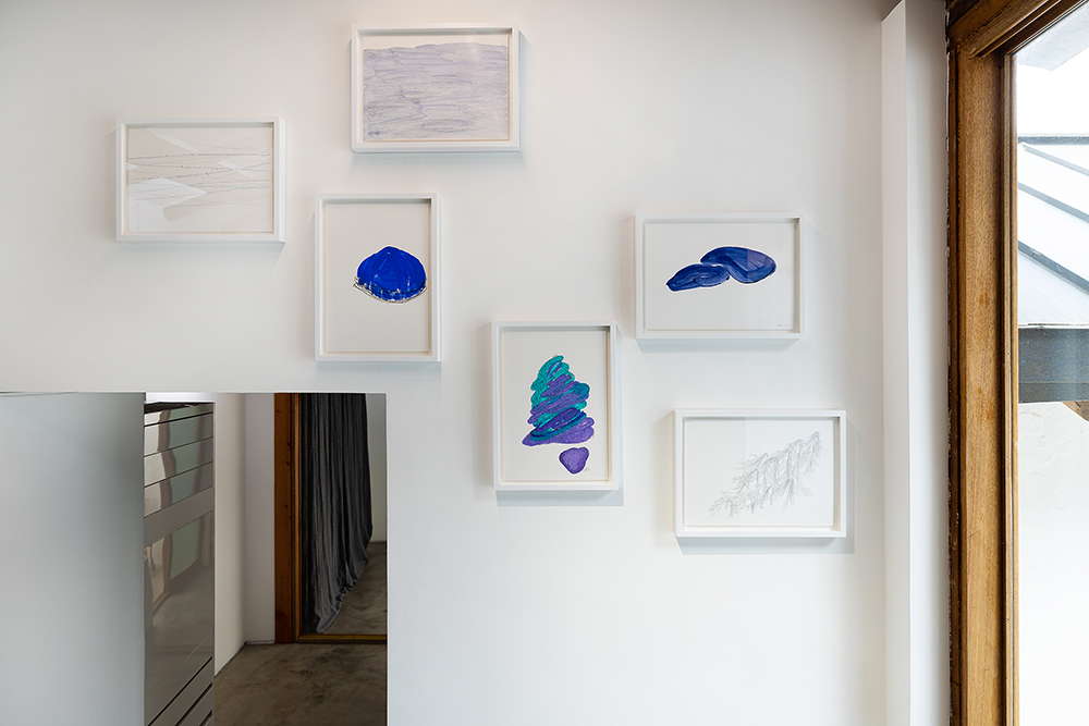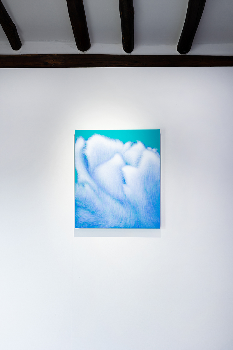 드로잉과 회화에 등장하는 대상은 고정되어 있지 않고 끊임없이 움직이고 있다. <G-Drawing>(2022-2023) 시리즈는 강릉 안목해변을 중심으로 물길을 따라 걸으며 만난, 미처 다가가기 전에 재빨리 사라지는 포말의 움직임을 순간의 곡선으로 드러내고 담담한 표면으로 완성시킨다. <Y-Drawing>(2021) 시리즈는 여수의 섬들을 탐방하는 여정에서 마주한 물, 바람, 섬을 향한 움직이는 시선을 기억 속 현장의 기운과 함께 종이에 고스란히 담아낸다. 풍경을 재현하는 것이 아닌, 실제 현장에서 경험한 그 상황에 몰입했던 대상의 인상을 즉흥적인 선으로 표현하는 것이다. 회화의 경우, 움직임의 진동은 화면 속 색면에 그릴 때마다 조색한 맑은 색의 선으로 수없이 쌓아 올리는 붓질의 행위와 맞닿아 있다. 느릿한 물의 호흡이 빛을 만나 윤슬을 드러내듯, 섬세하게 다른 색상의 선들이 서로 무수히 겹쳐 우연적인 면을 만들어낸다. 그 선은 부드러운 곡선의 형태이다. 캔버스에 아크릴 물감과 과슈를 사용하되 동양화 채색방식으로 표현한다. 즉, 캔버스 화면의 질감, 색의 투명도, 붓의 크기, 붓끝의 사용 면적, 그리는 손의 힘, 붓터치의 속도 등 여러 요소들이 동시에 작용하여 화면 속 깃털같은 표현이 완성된다.