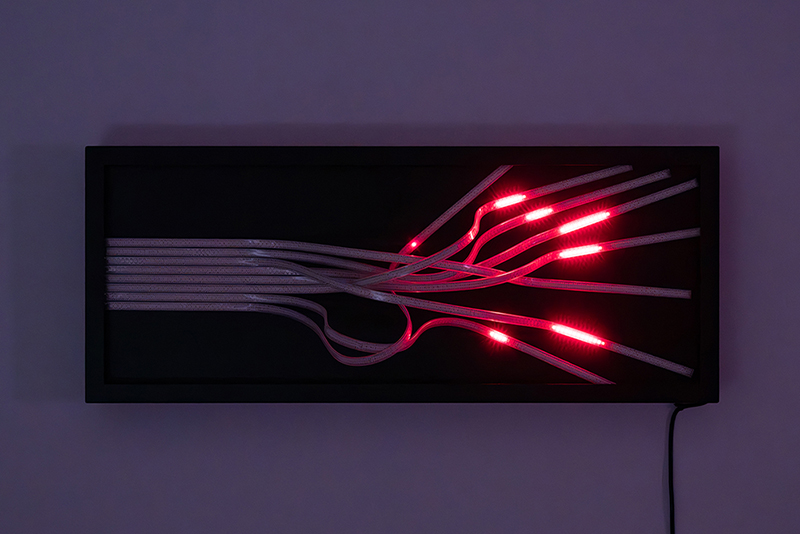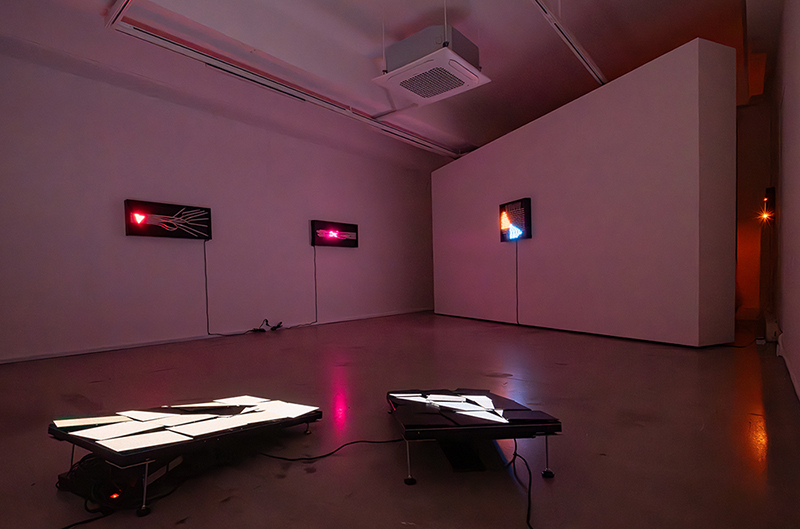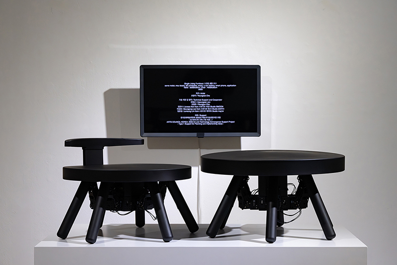 0과 1로 수치화된 정보에 의해서만 작동하는 디지털 프로그램은 변수를 만들지 않는 닫힌 체계이지만, 그 체계를 들여다보고, 패턴을 만들거나 새로운 구조를 덧붙여 다시 또 시스템화하면서 끊임없이 복잡계를 열어내는 일은 작가의 몫이다. 그 과정 안에서 작가들은 다양한 실험과 미적 실천을 전개하며 고유한 체계의 기술을 갖는다. 배재혁은 스페이스 캔 1층에서 LED라이트를 활용한 설치 작업과 영상 작업을 선보인다. 이는 작가가 뉴미디어의 환경에서 추상적으로 존재하는 시스템의 움직임을 빛을 매개로 하여 물리적 세계 속 오브젝트로의 변형을 시도하는 시리즈의 일환으로, 작품 안에서 그는 현대기술에 내재된 거대한 시스템과 그 구조를 바라보도록 요청한다. 스페이스 캔 2층에 위치한 조영각 작가의 작품은 인공지능 언어모델(AI LLM)을 기반으로 인간의 대화를 모방해놓은 〈대화상자〉(2024)와 테이블과 의자로 구성된 로봇 가구 〈1인용 생활가구〉(2023)이다. 작품의 제목에서도 알 수 있듯, 작가는 꾸준히 인간과 뉴미디어 시스템과의 유사성과 소통에 주목하면서 뉴미디어 작품들이 얼마나 생의 감각을 함축할 수 있는지 천착한다.