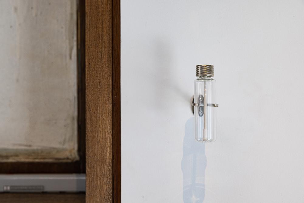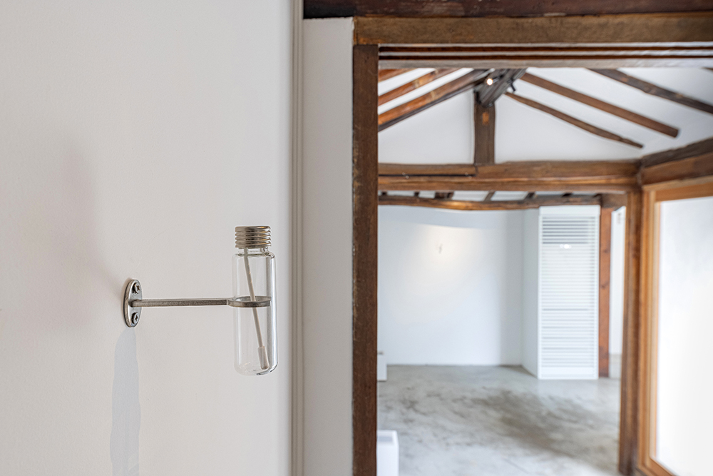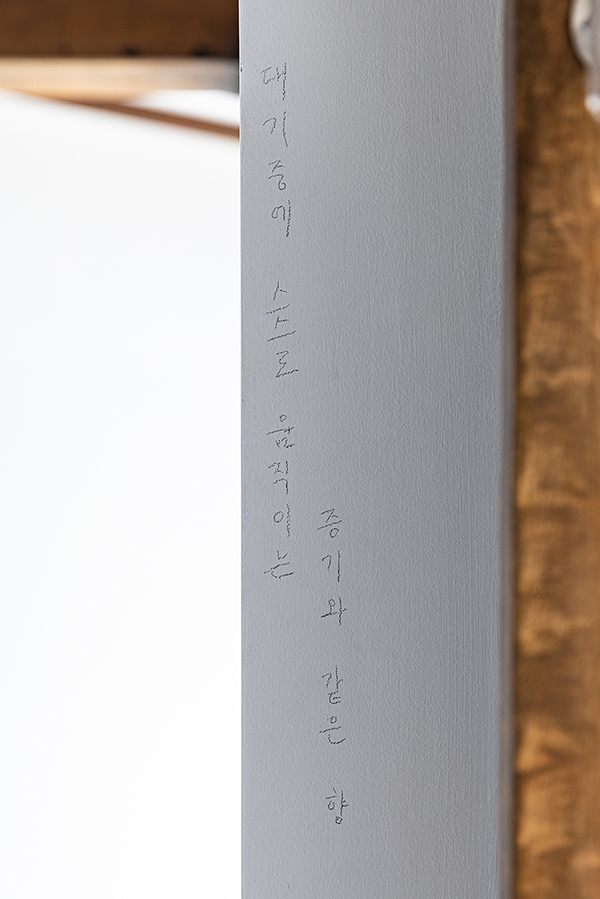 김지수 작가는 현 시대 비대면 기술로는 체험하기 어려운 후각감각을 이용한 작품을 진행한다. 장소특정성과 시간성을 갖는 전시 공간에서의 향의 발현은 대면으로의 전시만이 갖는 특징이자 감각을 표현이다. ‘이 순간의 향’ 작품은 전시기간인 7월과 8월의 습도와 공기, 100년이 다 되어가는 오래된 집의 서까래와 개조된 벽면을 스치는 향은 태초의 감각을 표현한다. 온라인 vr로 표현되는 또다른 작품 ‘다가온 미래의 향’은 오프라인 전시장의 재현과 복제로서의 작품이 아닌 실제는 발현되지 않는 가상의 향을 전시한다. 이는 향이라 말하고 후각감각을 이야기하지만 경험의 감각이 발생시킬 수 없는 기억의 감각임과 동시에 언어를 이용한 시감각이기도 하다. 또한 경험의 감각이 발생시킬 수 없는 무경험적 가상의 향이기에 라깡이 말한 ‘기표가 기의에 닿지 못하고 미끄러지’는 저마다의 창조와 창작의 감각 표현이기도 하다.