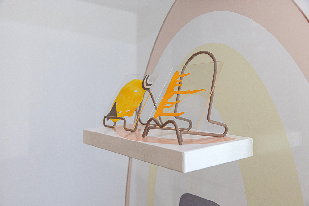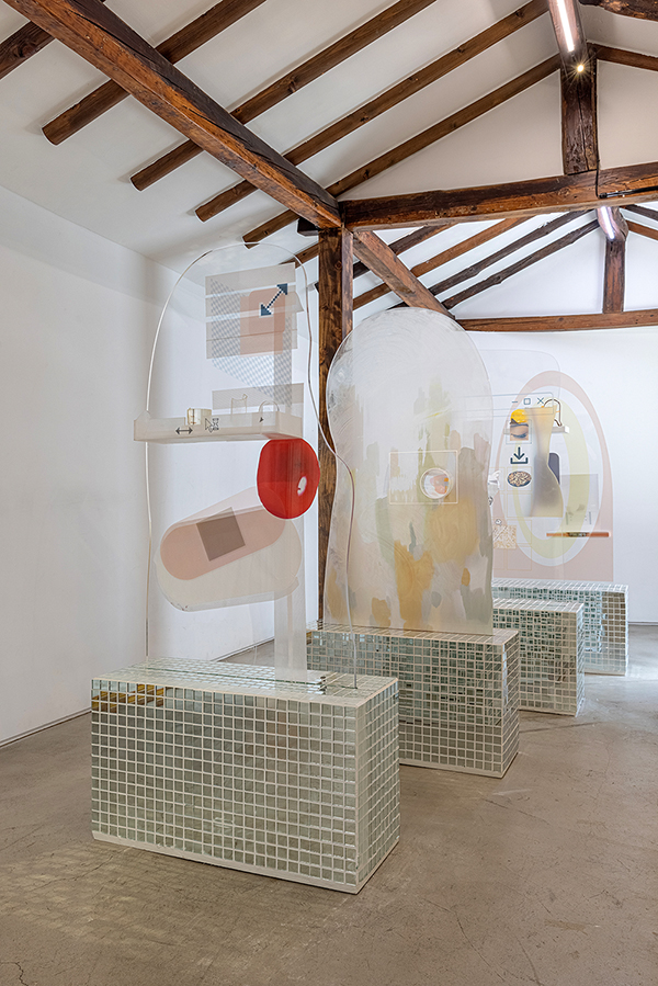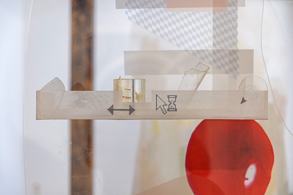 안솔지 작가는 비대면이라는 새로운 조건에 비대칭적으로 적응하는 수용 감각 중 후각을 제외한 시각과 촉각, 청각에 대응하는 신체적 반응을 작품으로 담아냈다. 작가이기도 타자이기도 한 사람의 형상을 가진 네개의 판넬 위에 각각의 감각의 표현 이미지들은 ‘변화를 피부로 체감하다’라는 언어적 감각 상태에 대한 표현이다. 만지거나 들을 수 없지만 경험해야 하는 시대가 다가왔고 또 앞으로도 다가오게 된다면 겪어낼 다양한 감각의 시각적 단일화는 네개의 판낼을 지탱하는 타일박스처럼 파현화된 sns상의 이미지 형태로 표현된다. 안솔지 작가의 또 다른 작품 ‘유실 시리즈’는 이미지로 가득한 세상과 반대되는 이미지 없는 세상을 나타낸다. 스크린을 상징하는 아크릴에 상징적 기호인 ‘이미지 없음’의 아이콘을 삽입해 이미지의 존재를 부정한다. 공업용 아크릴과 상반되는 모래의 중력에 의해 표현된 형상은 퇴초의 감각과 변이된 감각을 상징한다. 베르그송의 의식과 대상, 표상과 사물에 선행되는 ‘이마주’의 총체에서 작가의 이미지는 어떻게 소비되어질지 작가는 작품으로 질문을 던져본다.