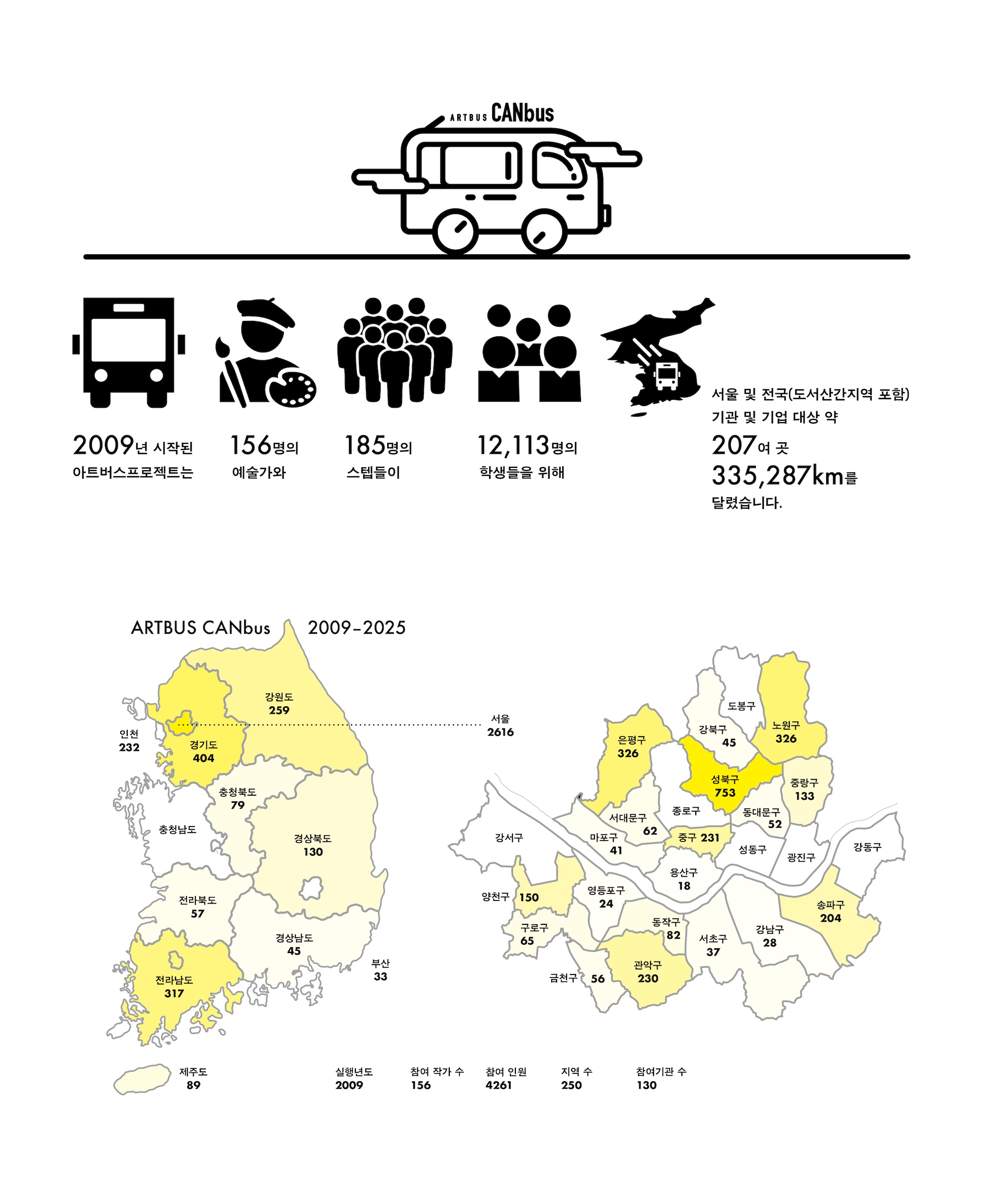 Since 2009, the ARTBUS CANbus program has delivered hands-on art experiences to underprivileged communities. By 2024, the initiative has traveled 335,287 km to 250 locations, engaging 156 artists and 12,113 participants. Post-pandemic, the program expanded to serve North Korean defector schools and community welfare centers, bringing art directly to those in need.
